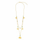 Bir umut, aşk ve uzun ömür sembolü olan Ginkgo Biloba, en eski ağaç türüdür ve René Lalique bu ağacı çizimlerinde sıkça tasvir etmeyi severdi. Ginkgo’nun el feneri şeklindeki yaprakları, mevsimlerle birlikte renk değiştirir; ilkbaharda canlı yeşil, yazın ise parlak sarıdan zengin altın sarısına dönüşür. Mücevher olarak yeniden yorumlanan bu tasarımda, zarif Antinea yeşil parlak kristal boncuklar, 18 ayar sarı altın kaplama pirinç Ginkgo yaprakları üzerine işlenmiştir. Yapraklar dalgalı ve ince oymalı detaylara sahiptir.